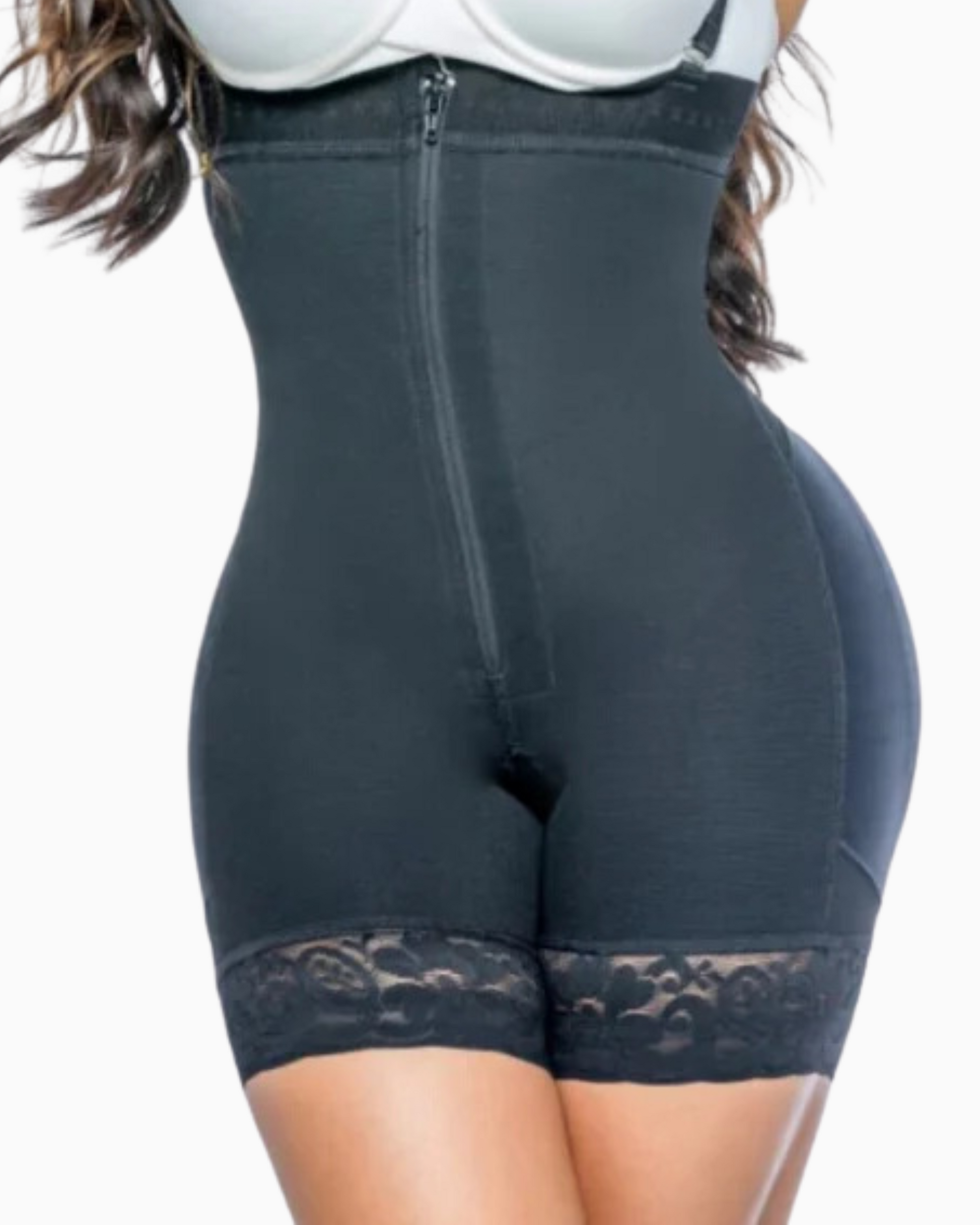 Boost your confidence with our shapewear made from mid-compression stretch PowerNet fabric. The soft Lycra interior ensures comfort against your skin. This versatile garment lifts your buttocks, controls your waist and hips, and features silicone lace, hooks, and a zipper for a secure fit, along with a perineal opening for added convenience. Plus, the waist is size-reduced for enhanced compression.